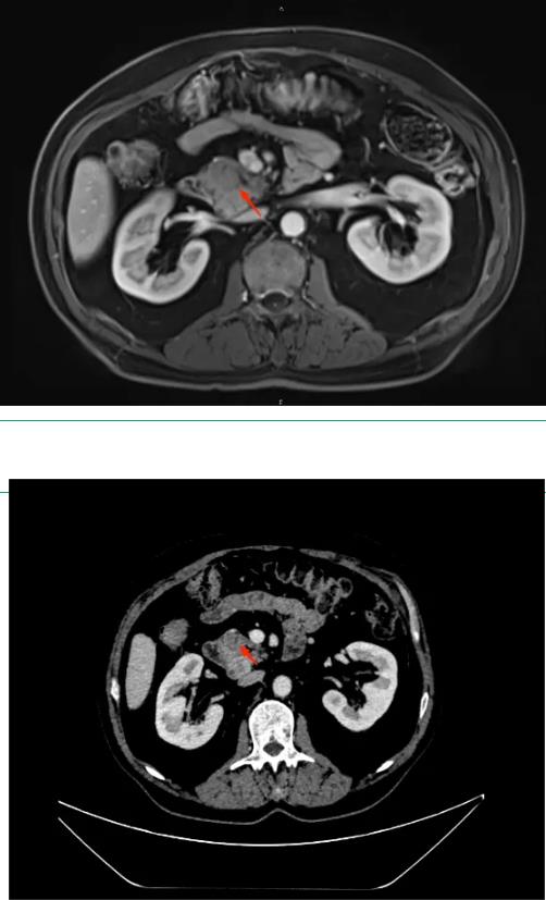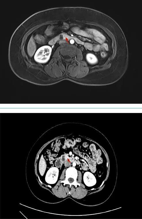 患者,女性,44岁,以“上腹部疼痛不适1周”入院,腹部CT及MRI提示胰头钩突-十二指肠水平部结节,考虑神经内分泌肿瘤可能性大,胰头周围多发淋巴结转移; EUS提示胰腺钩突部可见一0.9*0.7cm大小实性占位,行EUS-FNB病理结果回归提示神经内分泌瘤(NET G1)。