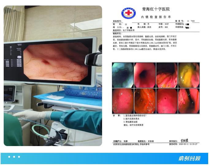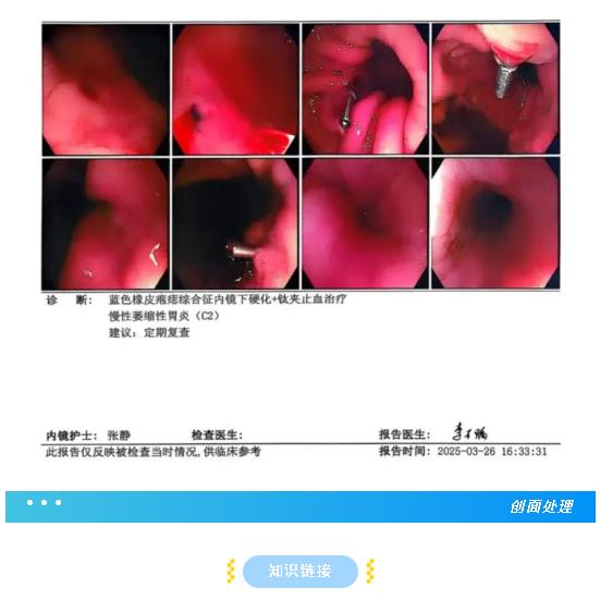 患者,男性,59岁,以“间断黑便20天,加重伴头晕,乏力3天”为主诉,急诊以“黑便,消化道出血原因待查”收住消化内科。患者于20天前无明显诱因出现黑便,伴腹胀不适,无呕血,鲜血便,前往当地医院给予禁食,止血,抑酸补液治疗后自觉症状略好转,于3天前流质饮食后,上述症状加重,伴头晕,乏力,为进一步诊断和治疗前来我院就诊,急诊完善相关检查及化验后,以“黑便,消化道出血原因待查”收住我科。患者于2025年3月11日做电子胃镜检查显示:1.蓝色橡皮样疱痣综合征?2.胆汁反流性胃炎3.胃黏膜贫血貌。