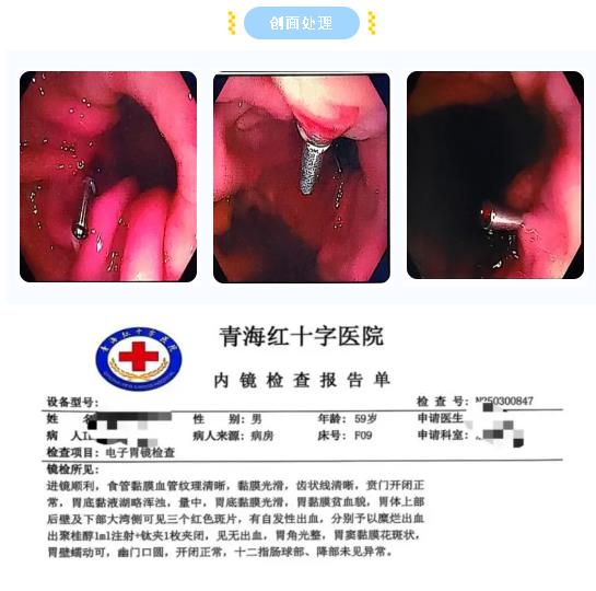 术前,李万瑀主任、吉栋德主任,李绥邦副主任及张英香护士长带领的内镜护理团队做了充足的术前准备和预案。内镜医生顺利进镜,可见胃黏膜贫血貌,胃体上部后壁及下部大弯侧可见三个红色斑片,有自发性出血,分别予以糜烂出血出聚桂醇1ml注射+钛夹1枚夹闭,观察创面无出血,胃角光整,幽门口圆,开闭正常。手术在李万瑀、李绥邦和吉栋德三位医生及内镜护士合作下娴熟地完成,整个手术耗时约一小时,术中无出血、穿孔等并发症。术后予以抑酸、止血、补液对症治疗,患者生命体征平稳。