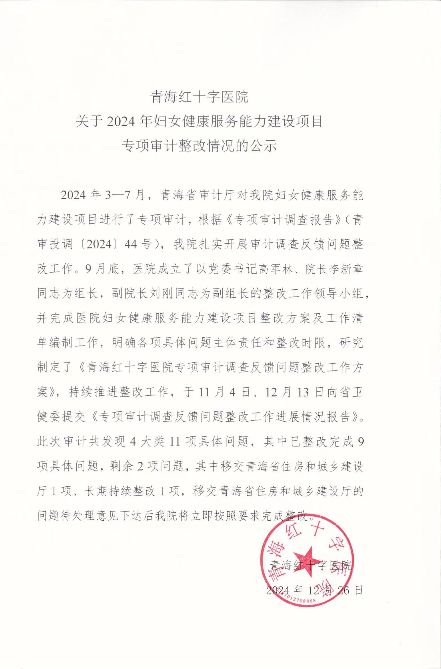 2024年3—7月,青海省审计厅对我院妇女健康服务能力建设项目进行了专项审计,根据《专项审计调查报告》(青审投调〔2024〕44号),我院扎实开展审计调查反馈问题整改工作。9月底,医院成立了以党委书记高军林、院长李新章同志为组长,副院长刘刚同志为副组长的整改工作领导小组,并完成医院妇女健康服务能力建设项目整改方案及工作清单编制工作,明确各项具体问题主体责任和整改时限,研究制定了《青海红十字医院专项审计调查反馈问题整改工作方案》,持续推进整改工作,于11月4日、12月13日向省卫健委提交《专项审计调查反馈问题整改工作进展情况报告》。此次审计共发现4大类11项具体问题,其中已整改完成9项具体问题,剩余2项问题,其中移交青海省住房和城乡建设厅1项、长期持续整改1项,移交青海省住房和城乡建设厅的问题待处理意见下达后我院将立即按照要求完成整改。
