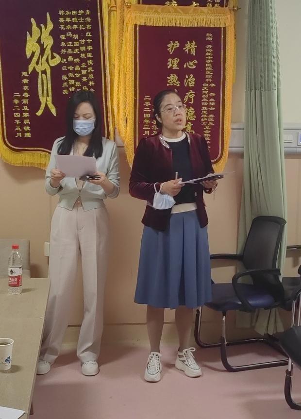 保卫科李祥善老师和心身疾病科主任张翠芳老师作出专业指导:病房安全管理中锐器的管理,及病房患者发生意外情况后必要时立即启动报警,由公安机关介入帮助,以免发生恶性事件;同时,对于首次诊断乳腺癌的患者,为了保护患者的安全,需有效与家属谈话,取得患者及家属的信任,引导家属及朋友给予心理支持治疗。