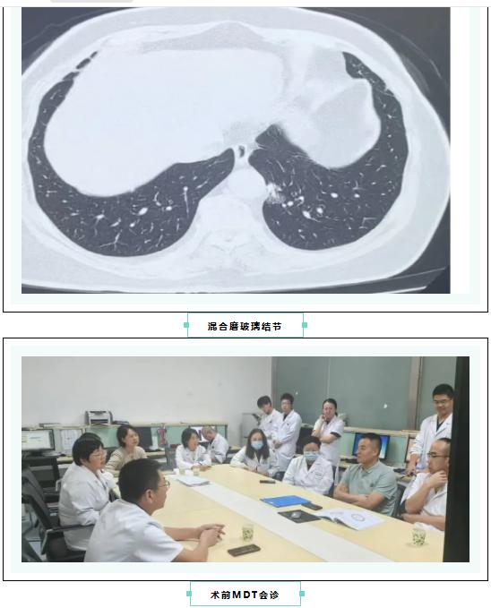 此次手术为一女性患者,因体检行胸部CT检查时发现左肺下叶后基底段存在一混合磨玻璃结节,大小约1.3×1.8cm,经我科阅片后考虑早期肺癌,建议手术治疗。且患者既往冠脉CTA提示重度狭窄,3月前已行冠脉支架植入术,术前经多学科会诊(MDT)讨论,结合影像学特征及患者身体状况,专家团队评估可以耐受手术。此次手术按计划进行。