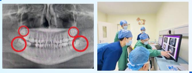 “一想到拔牙的针头和器械,我就紧张得浑身发抖,根本没法配合治疗。”患者卡女士反复强调,并坦言辗转多家医院,均因恐惧和拔除难度较大而未能施治。卡女士4颗智齿均处于复杂阻生状态,其中上颌2颗牙根位于上颌窦内,呈近中高位倾斜生长,上颌第二磨牙牙根因严重受压移位,存在牙根吸收趋势。下颌智齿牙根紧邻下齿槽神经管结构,拔除手术存在神经损伤风险。这类智齿拔除难度较高,不仅需通过微创去骨、分牙等精细化操作才能完整取出,更需精准避开邻牙、上颌窦及神经管,对术者技术、术后感染预防管理、口腔卫生维护、口腔护理及并发症预防等方面要求高。复杂智齿术后的面部水肿、疼痛等术后反应,比常规牙拔除发生率高,更是影响正常咀嚼与睡眠。另外卡女士为外院正畸患者,智齿拔除并保留足够骨量是实现磨牙远移目标的关键,过程中如何保留足够的骨弓宽度、高度与长度问题是口腔外科医生设计智齿手术方案重要的考量因素之一。患者口内已配戴固定矫正器,对手术视野与操作产生一定影响。青海红十字医院口腔医学中心接诊后,高鹏主任带领青少年智齿外科团队全面评估分析,CBCT精准测量,制定治疗与护理方案,第一时间联合麻醉科王学军主任团队开展多学科会诊与麻醉前评估。经全面评估,卡女士的智齿位置复杂、与周围组织关系紧密,拔除需精准避开神经、窦腔与血管,操作复杂且耗时长,传统局麻下患者难以配合,易引发术中紧张、呛咳,甚至增加神经损伤风险。为彻底解决患者痛苦,决定采用门诊全身麻醉方案,让患者在无意识、无痛状态下接受治疗,这也是目前牙科恐惧症患者复杂口腔治疗行为管理的科学有效的方法。