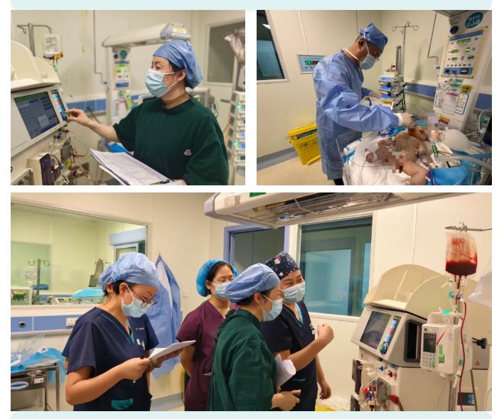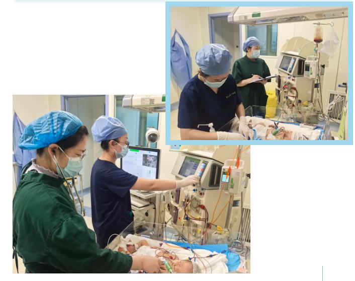 时间就是生命。面对凶险病情,为避免患儿病情继续恶化,新生儿重症医学科姚彦莉主任团队结合患儿具体情况,进行针对性细致评估后果断决定实施CRRT治疗。在麻醉科、ICU团队的通力协作下,新生儿重症医学科团队精准开展CRRT治疗,全程运用床旁重症超声,个体化局部枸橼酸抗凝方案,持续有创血压、CVP监测,精准调节CRRT的运行参数,实现个性化容量管理及血流动力学调控,确保治疗过程稳定。