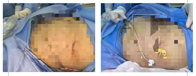 为给患者建立一条长期、高效、通畅且便于管理的输液通道,该例手术由乳腺外科李宗龙副主任医师在超声引导下完成穿刺置管,并在肝胆胰疝外科任国亮副主任医师的协助下顺利实施。术中选取左下腹髂前上棘与脐连线外1/3处作为穿刺点,将导管送至腹腔内预定长度后,撤出导管鞘,回抽见腹腔液并妥善固定导管;随后于左侧锁骨中线肋缘下2 cm处做切口,制备港座囊袋以安放输液港座,并在囊袋与原穿刺点之间皮下建立隧道,将输液导管经隧道引入后与港座连接,穿刺回抽确认见腹腔液后,逐层缝合各切口,包扎固定,术毕患者安返病房。