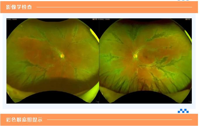 眼压:右眼 11.0mmHg 左眼 11.3mmHg 双眼睑无肿胀,结膜无充血,角膜透明,前房深浅可,房水清,虹膜纹理清,瞳孔圆,3mm大小,对光反射(+),晶体透明,眼底:右眼视盘边界清,色橘红,以后极部网膜为中心呈放射状分布骨细胞样色素,黄斑区可见“金箔样反光”,中心反光不见。 详情点击上方图片浏览