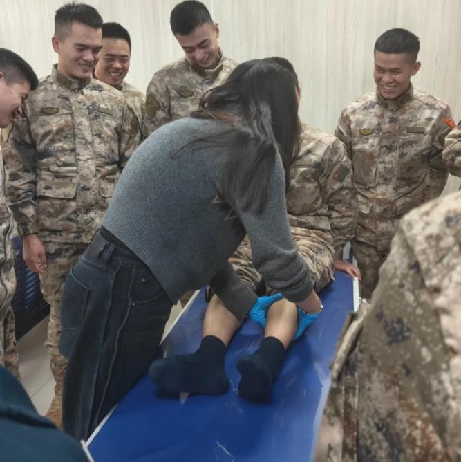 针对部队训练任务紧张、康复周期要求严格的特点,授课团队特别增设“快速康复技术在战时及高强度训练中的应用”专题内容,涵盖急性损伤后PRICE原则的优化应用、微创治疗后早期康复介入要点、重返训练前功能评估标准等实用知识。现场通过部队训练典型运动损伤康复案例的实操演示,具象化展示康复方案的制定逻辑与动态调整过程,极大增强了授课的实操性与指导性。